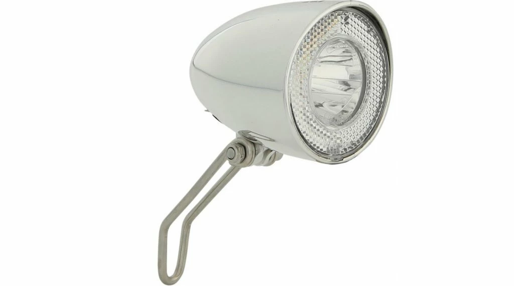 Le feu avant rĂ©tro avec boĂ®tier en plastique et rĂ©flecteur avant intĂ©grĂ©. La lampe rĂ©tro dispose Ă©galement d’une double connexion par câble, d’une protection contre les surtensions et d’un interrupteur pour la dynamo du moyeu.